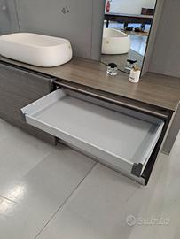 Composizione mobile per bagno, con ante complanari, in vero legno di larice spazzolato grigio antracite, lung. 171 p. 51 h. 73 con lavabo h. 93, completo di specchio inclinato e mensole sp. 5 cm, all' interno comodi cassetti estraibili in metallo