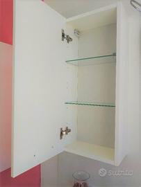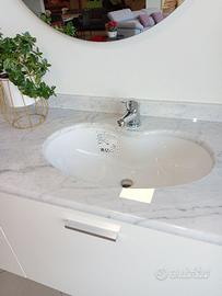mobile sospeso per bagno in finitura laccato opaco bianco con top in marmo di carrara . E' completo di elemento con cassettoni ,elemento con cassettone e cassetto interno , specchio con lampada , pensile e lavabo in ceramica. Le misure sono cm. 140 x cm. 50 prof.