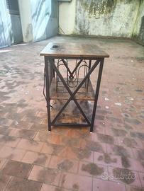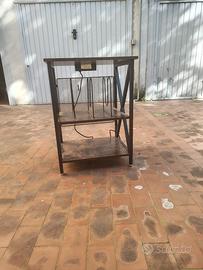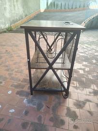 Supporto per giradischi e dischi in vinile. Ha due ripiani con divisori removibili. E' realizzato in legno scuro e metallo per supportare ogni tipo di carico. E' provvisto di presa multipla della corrente.