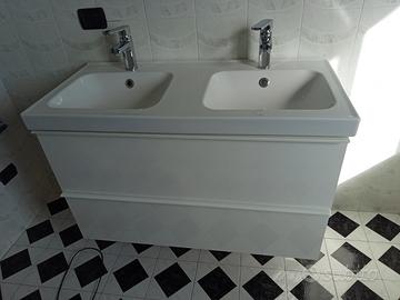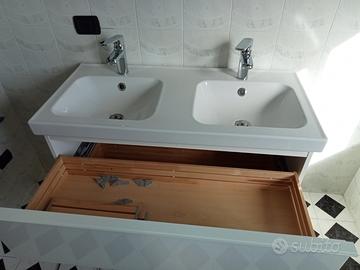 Mobile per lavabo doppio Ikea modello Angsjon bianco. Doppio lavello in ceramica, compreso del sifone e tutti i raccordi per lo scarico. Completo di tutto, come in foto, non presenta danni di nessun tipo. Misure 100x45x58 cm