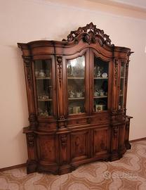 Mobile in noce con vetrine e tappezzeria interna, per sala da pranzo, come da foto. Ottimo stato, praticamente perfetto. Possibilità di tavolo coordinato con 6 sedie, stesso stile in noce. Trasporto o spedizione a carico dell'acquirente.