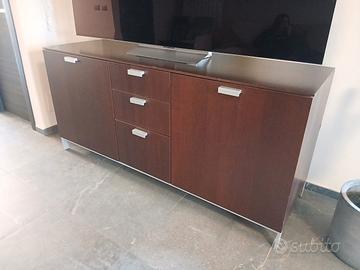 Mobile per salotto, madia, credenza color rovere scuro stile contemporaneo + mobile basso da tv con ripiani estraibili. Dimensioni profondità 57 cm, altezza 84 cm, lunghezza 180 cm. mobile tv 57 prof. x 180 cm. Tutto a 600 €