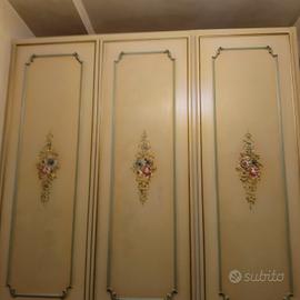 Questo mobile è un armadio in stile barocchetto veneziano, laccato color avorio con decorazioni floreali dipinte a mano.