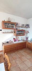 Mobile per soggiorno ad angolo, 243 x 195 cm, profondo cm 60, con 2 vetrinette e ripiani a muro. (vendibile separatamente anche tavolo con sedie e cucina abbinate - stesso legno). Smontaggio a carico dell'acquirente.