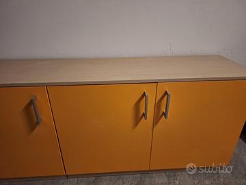 -Arancione sulle ante, con il piano superiore color legno chiaro (tendente al beige). Le maniglie sono di un grigio metallico.