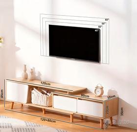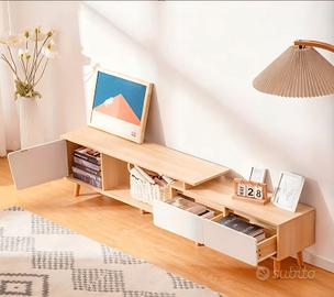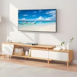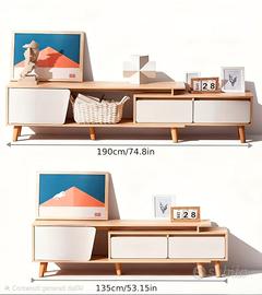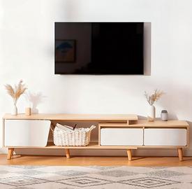 Se cerchi flessibilità e stile, questo mobile porta TV è la soluzione ideale. Grazie al suo design modulare ed estensibile, può adattarsi perfettamente sia a pareti ampie che a spazi più contenuti, mantenendo sempre un'estetica raffinata e moderna. ✨ Caratteristiche e Funzionalità: Larghezza Regolabile: Il design intelligente permette di estendere il mobile da una configurazione compatta a una più ampia, adattandosi alle tue esigenze di spazio. Stile Scandinavo: Legno chiaro naturale e frontali bianco opaco per un ambiente luminoso e accogliente. Organizzazione Ottimale: Scomparti chiusi per il massimo ordine e vani a giorno per i tuoi dispositivi multimediali. 📐 Dimensioni: Configurazione Estesa: Larghezza fino a 190 cm (ideale per grandi pareti e TV di ampie dimensioni). Configurazione Compatta: Larghezza minima di 135 cm (perfetta per ottimizzare lo spazio). Altezza e Profondità: [Inserire qui le misure se disponibili, es. Altezza circa 45 cm]. 💎 Materiali e Stato: Materiali: Legno di alta qualità con finiture resistenti. Piedini: In legno massello tornito per stabilità e facilità di pulizia. Stato: [Nuovo]. Il vantaggio del design estensibile: > Puoi cambiare la disposizione dei mobili in casa senza dover cambiare il porta TV. La sezione superiore scorre lateralmente, permettendoti di creare un piano d'appoggio extra per vasi, quadri o libri. Spedizione inclusa