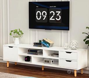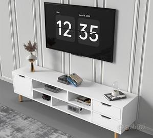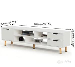 Rinnova il tuo salotto con questo mobile porta TV dal design minimalista e ultra-moderno. La finitura completamente bianca, abbinata ai piedini in legno naturale, crea un contrasto elegante che dona luminosità e un senso di ordine immediato a qualsiasi ambiente. ✨ Punti di Forza: Estetica Pulita: Linee geometriche e maniglie integrate a gola per un look senza tempo. Organizzazione Intelligente: * 3 Cassetti/Vani chiusi: Ideali per riporre documenti, telecomandi e accessori fuori dalla vista. 4 Vani a giorno: Perfetti per console, decoder, libri o piccoli oggetti di design. Stabilità e Altezza: I 5 piedini in legno garantiscono una stabilità perfetta e permettono il passaggio dei robot aspirapolvere (come mostrato in foto) per una pulizia senza sforzo. 📐 Dimensioni Precise: Larghezza: 140 cm Profondità: 30 cm Altezza (corpo mobile): 26,5 cm Altezza totale: [Inserire altezza totale inclusi i piedini, stimata intorno ai 40-45 cm] 💎 Specifiche Tecniche: Colore: Bianco opaco / Legno naturale. Materiale: Struttura robusta con finitura antigraffio. Stato: [Inserire: Nuovo in imballaggio / Ottimo stato]. Ideale per chi ama l'ordine: Grazie ai numerosi scomparti, ogni cosa troverà il suo posto. Le dimensioni compatte (30 cm di profondità) lo rendono perfetto anche per corridoi o zone living non troppo ampie, senza rinunciare a un grande piano d'appoggio per la TV.