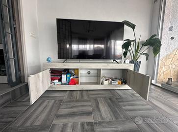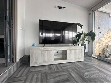 Mobile basso x soggiorno, da utilizzare anche come Porta TV, 2 ante con vano a giorno e ripiano in vetro, color Pino Bianco, mantenuto in ottime condizioni. Misure L.184 P.41 H.42 Trasporto e smontaggio a carico dell’acquirente. Il mobile si trova a Lido dei Pini.