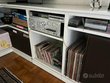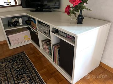 Vendo ribusto modile bianco (NO IKEA) ad angolo ideale per salotto o camera come porta televisione, stereo e esposizione dischi in vinile, cassette, dvd e libri. Misure: larghezza complessiva 187cm, profondità lato minore (sinistra) 112cm, profondità lato maggiore (destra) 61cm, altezza 73cm. Da smontare. Facilità di ritiro (solo due piccole rampe di scale) grazie al passo carrabile davanti a casa!