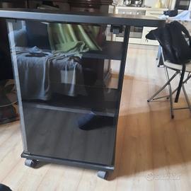 Mobile nero per televisore son vetrina davanti e ripiani all'interno, Dotato di routine che rendono più facile lo spostamento. Alto 81 cm compreso le ruote, profondità 46cm e larghezza 73