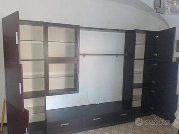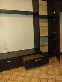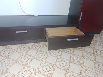 Mobile da parete composto come in foto da 2 colonne laterale di ante chiuse color bordeaux e altre 2 antine in vetro mentre nello spazio centrale vi sono una mensola superiori e 2 cassettoni alla base su cui è possibile appoggiare la televisione.