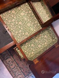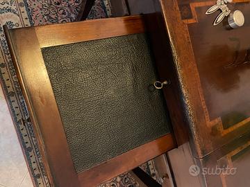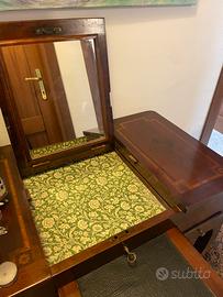 Pettiniera antica dell’800 in legno. Dotata di sedia, specchio, scrittoio in pelle. Cassetti e parti interne rivestite di carta colorata. Pezzo d’antiquariato in perfette condizioni. Prezzo trattabile.