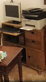 Mobile per PC, artigianale, in vero legno, colore noce, misure H86 - L 100 - P 33, dotato di due grandi cassetti, due grandi vani con sportelli, base estraibile porta tastiera e mouse, base/mensola porta monitor e stampante, base/mensola porta stereo e casse PC, base/mensola porta unità centrale del PC, diversi vani porta hard-disk (almeno 4). Il mobile è sollevato da terra da n.5 piedini.