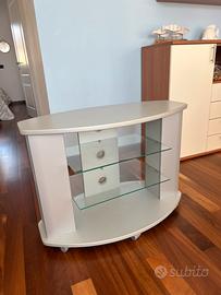 Vendesi mobile porta tv con vari ripiani (alcuni in vetro), provvisto di passaggio cavi e di ruote. Misure: larghezza 90 cm, profondita’ 44 cm, altezza 64 cm.