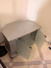 Vendesi mobile porta TV con struttura angolare, ideale per ottimizzare gli spazi negli angoli delle stanze. Il mobile è dotato di un ripiano interno in vetro e due ante frontali in vetro satinato. Sul retro è presente un foro passacavi per la gestione dei collegamenti elettrici.