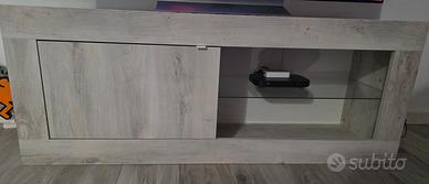 Mobile porta Tv con Anta effetto pino bianco. Misure 139x42x56h Colore effetto legno pino bianco Mobile porta Tv con mensola in vetro e Anta con buona capienza, facile da pulire. Foro per cavi già presente. Ottime condizioni come nuovo. Ritiro in loco no spedizione