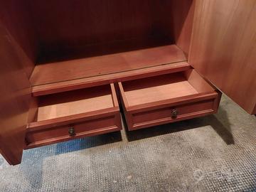 Vendo mobile porta TV in legno con rotelle e base girevole per orientare la TV. Il mobile ha anche due antine e una mensola in vetro per poter riporre liquori, libri o altro. Al di sotto delle antine vi sono anche due cassettini.