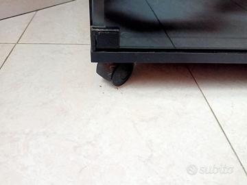 mobile porta tv e altro, colore nero, larghezza cm. 83 altezza cm. 80 profondità cm. 47 n. 2 ante in robusto vetro cm. 48 e cm. 33, foro posteriore per cavi, n. 4 ruote girevoli, all'interno due ripiani, materiale legno e vetro. Ottime condizioni