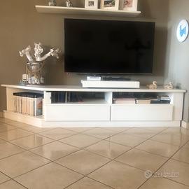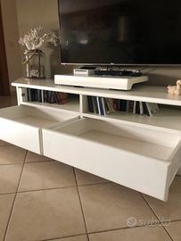 Mobile in legno di ciliegio europeo, verniciato di bianco, con ripiani, 2 grandi cassetti e un porta tv girevole e scorrevole in avanti.