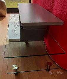 2 ripiani in vetro dimensioni L. m. 1,30 P. cm. 50 Ripiano superiore in laminato grigio L. m. 1 P. cm. 30.. Altezza da terra cm. 55. Al centro 2 cassetti porta CD con antina lucida. Il ripiano grigio presenta 2 fori perché era fissato il mio TV. OTTIMO STATO - SMONTABILE -
