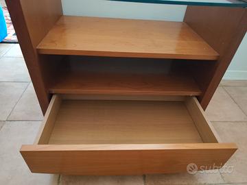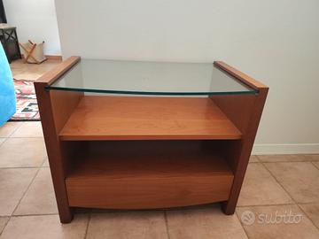 Piano in cristallo di 1 cm, due ripiani e un cassettone. Misure: h60, l 75,5, profondità max 48