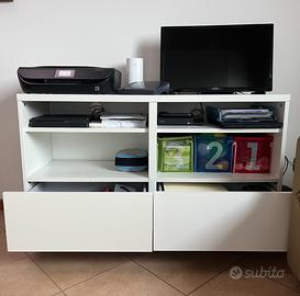 Misure: larghezza 120 cm, profondità 40 cm, altezza 75 cm con le ruote. Mobile capiente e funzionale. Dispone di due ampi cassetti. Predisposizione sul fondo per il passaggio dei cavi. Deve essere ritirato dall’acquirente.