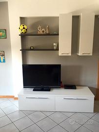 Mobile laccato, comprensivo di colonne, mensole e pannello finitura rovere grigio. È un Mobile estremamente robusto perché di mobiliere, presenta delle righe sul piano non visibili più di tanto e il l bordo in basso a destra è leggermente sollevato.
