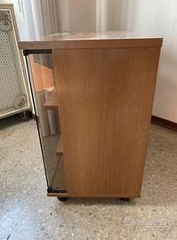 Carrello Porta TV moderno con ante in vetro e rotelle in noce chiaro L 82 cm x P 50 cm x H 55 cm. Mobile porta tv - libreria con rotelle. In perfette condizioni.