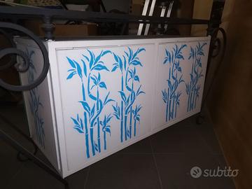 Mobile porta TV fatto a mano, pezzo unico, struttura in metallo e pareti in legno con ripiano in vetro, 2 ante frontali, molto capiente.