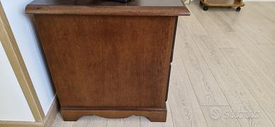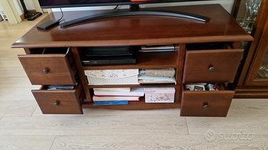 Utile mobile porta TV con quattro cassetti e tre ripiani, legno massello stile "arte povera" e rifinitura in noce. Misure 117 x 49 x altezza 53 cm. Prodotto usato in buonissime condizioni, tutto perfettamente funzionante. Vendo per cambio arredo.
