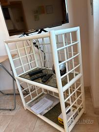 Regalo mobile porta TV in vimini con ripiani in vetro, in buone condizioni. Stile naturale e leggero, ideale per salotto, veranda o casa al mare.