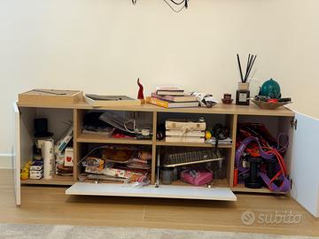 Mobile porta TV, Credenza bassa da soggiorno, Madia da salotto per televisione, 142x35h44 cm, Bianco e Rovere
