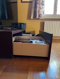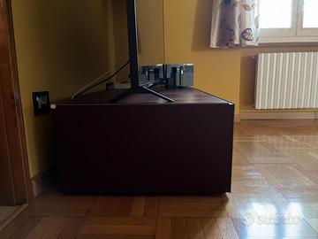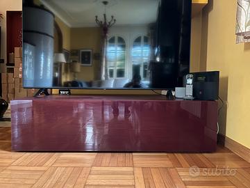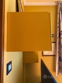Spaziosa base porta tv con cassetto + spazioso pensile con reparto orizzontale e reparto verticale scaffalato. Misure mobile rosso: 147x70 cm. Misure mobile giallo: 148x40 (parte orizzontale), 148x73 (parte verticale).