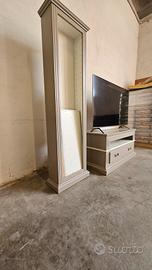 mobile porta TV con vetrinetta a giorno con ripiani e 2 mensole sospese. in legno massello laccato bianco grigio.