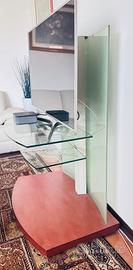 Mobile porta tv con base in ciliegio, due mensole in vetro e parete esterna in vetro satinato