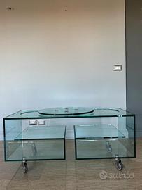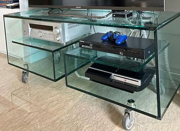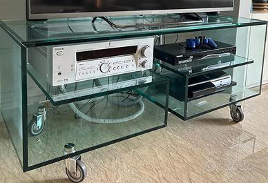 Mobile Porta Tv di vetro Tonelli Design Mod. Flò 1. Mobile porta tv multiuso su ruote con struttura in vetro trasparente o in vetro trasparente. Ideato dal famoso designer Isao Hosoe, "Flò 1" grazie al movimento su ruote e ai suoi piani di appoggio è un mobile versatile e adatto a diversi utilizzi in ogni ambiente. .Misure: L 120 x P 45 x H 52 cm.