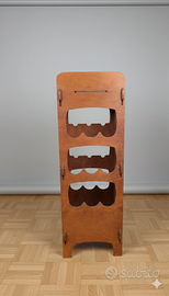 Vendo elegante mobile portabottiglie/espositore in legno con moderno sistema di montaggio a incastro. Il design è caratterizzato da fianchi sagomati con linee curve, ideale per arredare con gusto una cucina, una taverna o per l'uso professionale in una vineria o enoteca.