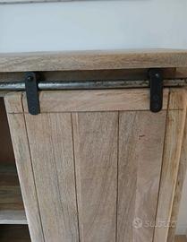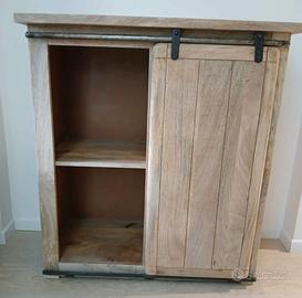 Mobile portabottiglie in legno di mango composto da due parti, a destra troviamo un cassetto e un portabottiglie con capacità di riporre 18 bottiglie e a sinistra un mobile diviso da 2 ripiani . L' anta scorrevole consente di nascondere il portabottiglie o l'armadio, con un tocco industriale dato dai dettagli in ferro invecchiato. Misure:altezza 99 cm,larghezza 89 cm, profondità 40,5 cm, peso 45 kg. Non smontabile ,unico pezzo realizzato a mano ,molto robusto.