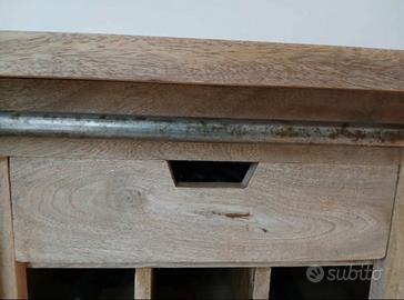 Mobile portabottiglie in legno di mango composto da due parti, a destra troviamo un cassetto e un portabottiglie con capacità di riporre 18 bottiglie e a sinistra un mobile diviso da 2 ripiani . L' anta scorrevole consente di nascondere il portabottiglie o l'armadio, con un tocco industriale dato dai dettagli in ferro invecchiato. Misure:altezza 99 cm,larghezza 89 cm, profondità 40,5 cm, peso 45 kg. Non smontabile ,unico pezzo realizzato a mano ,molto robusto.