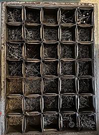 Portaminuteria vintage, composto da piano con 35 piccoli contenitori di metallo estraibili e due ripiani di legno. Misure: larghezza 75,5 cm, profondità 55,5 cm, altezza 85,5 cm. Oggetto unico nel suo genere.