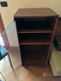 Mobile con vetro temperato per sistema hi fi altezza 102, profondità 44, larghezza 49. Presenta un difetto come da foto. Piedini con rotelle