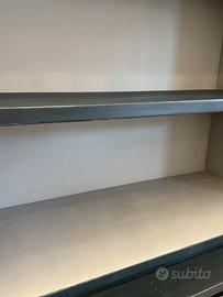 Mobile in legno decapato adattissimo da ufficio o arredamento composto da una cassettiera, due ante e scaffali. Misure…lunghezza mt 3,60 larghezza 50 e altezza 2.45