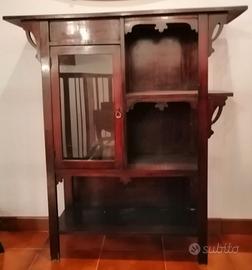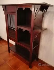 Mobile in stile Liberty, in legno massello, dei primi del ‘900 con vetrinetta e con ripiani porta oggetti a vista. Dimensioni: Lunghezza 99 cm; Profondità 27,5 cm; Altezza 110 cm.