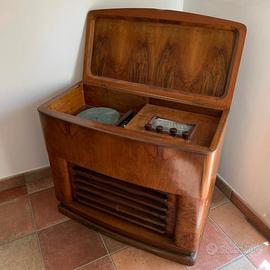 Mobile in legno (noce/radica) degli anni '40 che integra una radio a valvole e un giradischi. Pezzo d'arredo originale dell'epoca, di grande impatto estetico. Necessita di restauro elettrico.