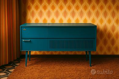 Dotato di vani interni per radio e giradischi dell’epoca, ideale come pezzo d’arredo di design o per chi vuole ripristinare un impianto vintage.