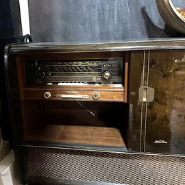 mobile radio giradischi prodotto dall'azienda tedesca Kuba, con sintonizzatore radio a valvole e giradischi anni ?50; mobile in legno impialliciato in legno lucido. Non Funzionante.