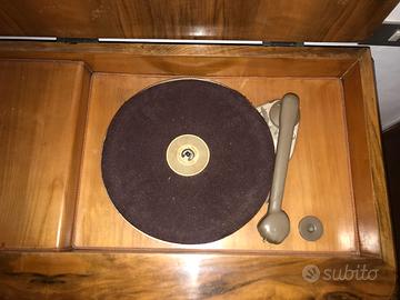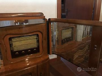 Mobile radio giradischi anni '40 in radica, con piano superiore giradischi, ante centrali porta bottiglie, fascia inferiore con griglia in legno e 2 vani per dischi. Ritiro a mano non spedisco