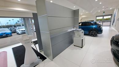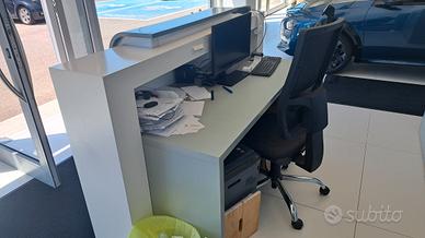 mobile da reception o desk, adatto a concessionaria o altri uffici che hanno una reception, adatto sia con montaggio nel mezzo, sia appoggiato ad una parete, ovviamente si possono rimuovere i marchi e la tela. Compresa anche scrivania reception. Sia scrivania che mobile sono dotati di strisce luminose.