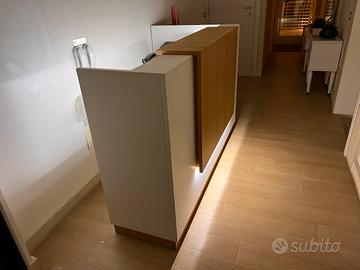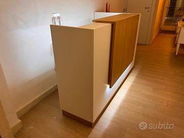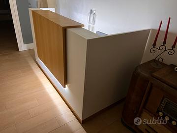 Vendo mobile reception da utilizzare anche come mobile domestico bar illuminato artigianale con profili in mogano, restante parte in legno multistrato laminato. Misure altezza 110 centimetri, lunghezza 173 centimetri, lato ingresso 45 centimetri, lato chiuso 95 centimetri