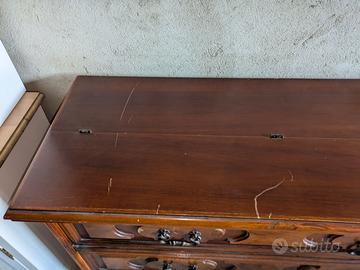 Mobile con ribalta con 8 cassetti piccoli e 2 capienti cassetti al di sotto. Misure h 91, p 50, l 122.